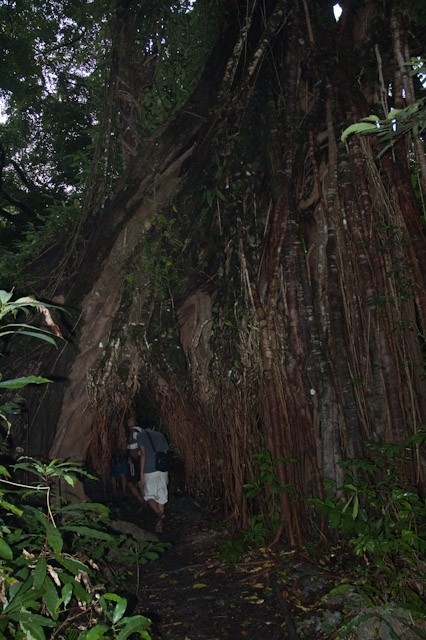 Salah satu jalur trekking yang cukup mengasyikkan untuk dijelalahi adalah Cibom - Tanjung Layar dengan kontour tanah merah dan berubah jadi lumpur dikala musim hujan. Vegetasi jalur trekking yang berjarak kurang lebih 1.7 km ini didominasi oleh pepohonan yang cukup tinggi, salah satunya adalah Pohon Kiara berlubang yang tumbuh tepat ditengah jalan. Untungnya pohon raksasa ini mempunyai lubang yg cukup besar diantara akar, sehingga orang bisa melewatinya.