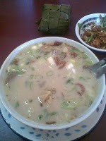 Saya tidak pernah membayangkan sebelumnya bahwa ubi goreng bisa dijadikan campuran utama hidangan sup. Ternyata rasanya lumayan enak dan segar. Potongan ubi goreng dicampur kecambah, potongan paru goreng, mie, dan bahan tambahan lainnya dan akhirnya disiram dengan kuah yang tidak jauh beda dengan kuah sup pada umumnya.