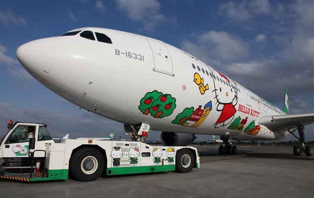 Jika Anda sedang berada di Taoyuan International Airport yang berada di Kota Taipei, Taiwan, pandangan Anda pasti tak lepas dari pesawat terbang bergambar Hello Kitty yang parkir di lapangan terbang.