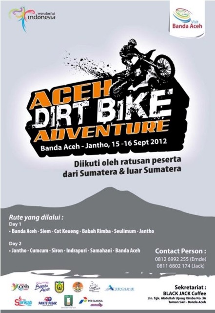 Indonesia, Aceh, Banda Aceh - Aceh Dirtbike Adventure akan menempuh rute Banda Aceh-Aceh Besar yaitu hari pertama menjelajahi Banda Aceh-Siem-Cot Keueng-Babah Rimba-Seulimum-Jantho, kemudian hari kedua yaitu Jantho-Cumcum-Siron-Indrapuri-Samahani-Banda Aceh.