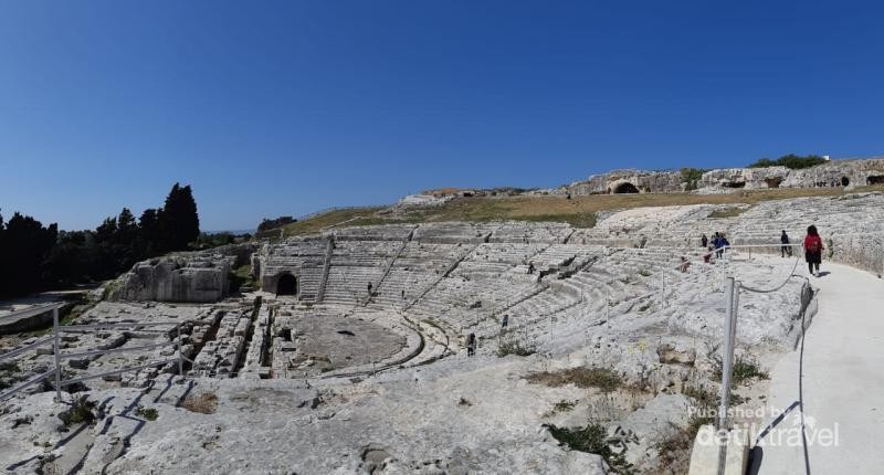 Siracusa, Teater Yunani yang Dramatis BAGIKAN URL telah disalin Teatro Greco (Teater Yunani). Di bangun abad ke 5 SM dengan 59 baris yang bisa menampung 15.000 orang Grotta del Museion, saluran air yang dibangun pada masa Yunani kuno dan masih berfungsi sampai sekarang Orecchio di Dionisio, goa yang berbentuk seperti telinga. Roman Ampitheater yang dibangun pada abad ke 2. Digunakan para gladiator untuk bertarung melawan hewan buas seperti singa Pemandangan dari atas Teatro Greco terlihat laut dan Basilica Santuario Madonna Delle Lacrime yang merupakan ikon kota Siracusa