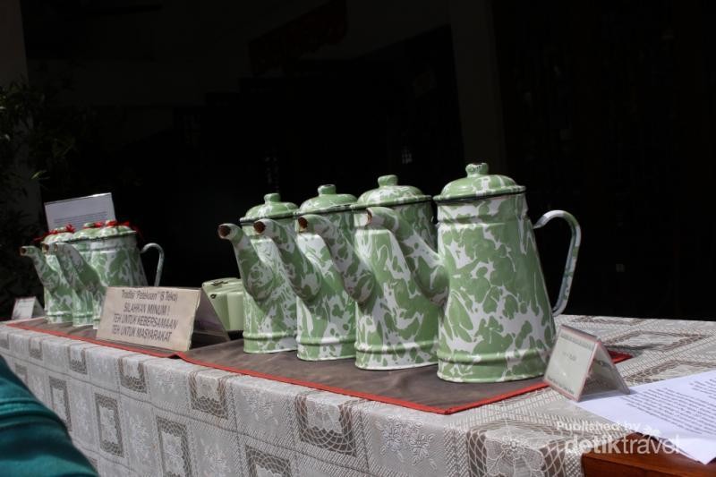 Teko dan cangkir yang diletakkan di atas meja kecil di depan tea house.Teko dengan pita diatasnya berisi teh manis , sedang teko tanpa pita berisi teh pahit.