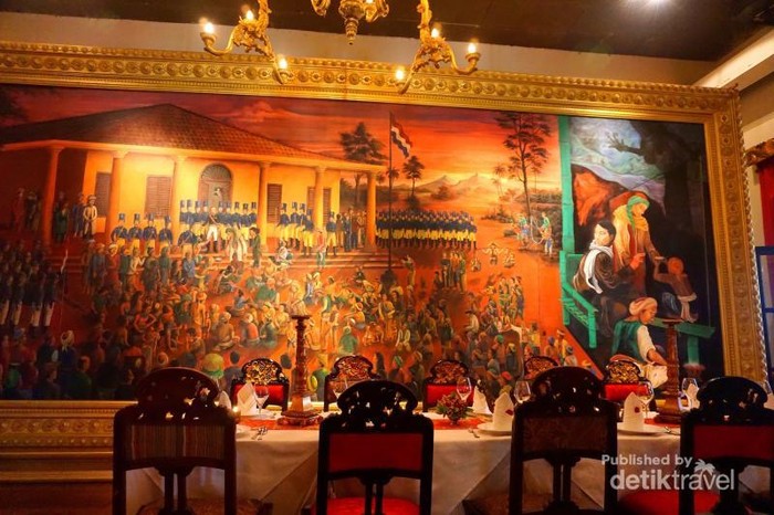 Jakarta - Penasaran seperti apa kemewahan jamuan makan di zaman kolonial tempo dulu? Tugu Kunstkring dapat menjawab semuanya.Terletak di Jalan Teuku Umar Menteng, terdapat restoran klasik dan megah bernama Tugu Kunstkring Paleis. Dilihat dari bahasa Belanda, arti kata Kunstkring adalah lingkaran seni. Bangunan ini sudah mengalami beberapa kali perubahan fungsi. Pada tahun 1950 sampai dengan 1993 ini merupakan gedung imigrasi. Kemudian pada tahun 2008 menjadi Budha Bar, tapi hanya bertahan setahun karena kontroversi.Kemudian saat ini menjadi Tugu Kunstkring Palace yang merupakan restoran berkonsep gallery seni, berdiri sejak 2013. Gedung ini masih menjadi milik Pemerintah DKI Jakarta. Karena diimbau untuk dialihkan fungsinya menjadi gallery seni, maka kemudian diserahkan kepada Manajemen Hotel Tugu untuk mengelola, yaitu bernama Anhar Setjadibrata selaku pendiri Group Hotel Tugu dan Restoran. Dengan syarat tetap menjaga keaslian dan keasrian bangunannya, tidak boleh ada perubahan bentuk.Tugu Kunstkring Paleis menyediakan pengalaman makan yang berbeda dengan restoran-restoran lain. Interior ini dipenuhi oleh koleksi seni selera tinggi dan antik warisan keluarga besar raja gula Oei Tiong Ham. Terdiri dari dua lantai, dengan dominasi warna hitam, emas dan merah. Setiap ruangan diberikan konsep berbeda dan memiliki tema masing-masing.Saat memasuki bangunan ini tamu akan disambut dengan lobi yang bernuansa homy, yang kemudian akan menuntun kita menuju Ruang Diponegoro. Berbentuk dining hall yang sangat luas dengan dua meja jamuan klasik panjang serta meja ukuran empat orang yang mengitari sekitarnya.Terdapat lukisan besar The Fall Of Java yang menceritakan kisa penangkapan Pangeran Diponegoro di Magelang pada tahun 1830. Di samping Ruang Diponegoro terdapat ruangan dengan bar di sisi samping bernama Suzie Wong Lounge. Dengan poster The World Of Suzie Wong, yang merupakan film di tahun 1950 berlokasi setting di Hong Kong. Ruangan ini dihiasi Gebyok Cina, lampu lampion sepanjang ruangan serta lampu temaram yang membuat anda merasa di daerah pecinan saat malam hari.Lanjut ke lantai dua, saya memilih menggunakan tangga dibanding lift. Karena sangat antik seperti tangga di Eropa tempo dulu dengan nuansa merah dan hitam. Di lantai dua ini yang paling menarik perhatian saya adalah Ruang Soekarno, disambut dengan kliping kumpulan berita kematian dan pemakaman Presiden pertama Indonesia tersebut.Berkonsep private dining dengan meja panjang yang megah seperti acara jamuan makan di Eropa. Ruangan dipenuhi dengan memorabilia Presiden Soekarno dan juga lukisan Presiden Soekarno dengan dua orang penari Bali yang menggambarkan kecintaan Presiden Soekarno pada Bali. Di mana Bali merupakan tempat lahir Ibu Presiden Soekarno dan Istana Tampak Siring adalah buatannya. Ada aura magis yang sulit saya jelaskan saat Anda memasuki ruangan ini.Makanan yang disajikan di sini sangat kaya rasa, dengan menu yang berasal dari Indonesia, peranakan China dan Belanda. Dimulai dari Laksa, Kungpao Crispy Duck, Rundvleis Kleine Aardappelen rendang, Apelflappen dan Poffertjes. Rekomendasi saya saat ke sini Anda harus mencoba Nonya Laksa dan Apelflappen. Sesuai dengan apa yang dikatakan Napoleon Bonaparte, bahwa seseorang bisa dinilai dari cara makan dan hidangan yang dimakannya.Ungkapan tersebut menggambarkan jamuan makan yang merupakan simbol kemewahan dari status sosial seseorang. Jadi jamuan makan bukan hanya pengisi perut tetapi menikmati kelezatan makanan, keindahan serta kesenangan dan kebahagiaan saat jamuan makan tersebut. Bagaimana dengan kalian para penikmat kuliner? Apabila penasaran silakan datang ke Tugu Kunstkring Paleis dan rasakan kemewahannya.