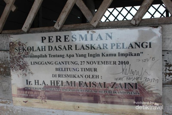 Jakarta - Novel Laskar Pelangi dan Belitung memang tidak terpisahkan. Bahkan sekolah Ikal dan kawan-kawan, latar tempat novel menjadi destinasi ikonik di Belitung.Saat tiba di bandara H.A.S Hanandjoeddin , gerimis menyambut kami .Suasana hujan siang itu tidak menyurutkan kegembiraan kami karena tiba di Belitung dengan selamat. Kami pun siap berkeliling Belitung.Jadwal pertama kami, menuju ke Belitung Timur. Oh ya, Belitung terbagi menjadi 2 kabupaten yaitu Belitung Timur dengan ibukota Manggar dan Belitung dengan ibukotanya Tanjung Pandan. Dalam bahasa setempat Belitung sendiri disebut Belitong.Perjalanan menuju Belitung Timur kami tempuh sekitar 1 jam , sepanjang jalan kami menyusuri perkebunan , lahan kosong , perkampungan dan sisa-sisa tambang . Dengan kondisi jalan yang relatif sepi dan lancar kendaraan kami meluncur nyaris tanpa hambatan. Tujuan pertama kami adalah replika sekolah Laskar Pelangi.Lokasi replika SD Laskar Pelangi ini terletak di Kecamatan Gantung. Saat kami tiba sudah banyak pengunjung yang berada di tempat ini. Bangunan sederhana yang hanya terdiri dari 2 kelas ini, dilengkapi dengan tiang bendera beserta benderanya.Dibagian depan terdapat papan nama peresmian sekolah tersebut, juga terdapat tulisan replika sekolah laskar pelangi yang dilengkapi dengan bangku-bangku kayu , dimana pengunjung bisa berfoto. Tempat ini menjadi lokasi berfoto favorit pengunjung.Meski terbilang sederhana untuk ukuran tempat wisata, tetapi sekolah ini memiliki daya tarik yang cukup besar. Rupanya novel laris milik Andrea Hirata cukup berkesan sehingga banyak pengunjung yang ingin tahu dan merasakan sedikit bagaimana kondisi seperti pada novel itu.Tempat ini sudah dilengkapi dengan tempat parkir yang cukup luas, warung penjual makanan dan minuman juga toko cendera mata. Jika penasaran bagaimana Ikal dan tokoh lain dalam novel Laskar Pelangi menjalani hari-hari selama di sekolah dasar dengan suasana serba prihatin, datanglah ke tempat ini.