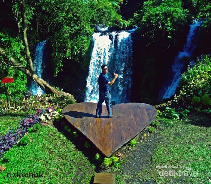Jakarta - Kalau berlibur ke Purwokerto, sempatkan diri untuk datang ke Curug Jenggala. Air terjun ini populer karena cantik dan instgenic.Curug Jenggala berada tidak jauh dari pusat Kota Purwokerto, sekitar tiga puluh menit ke arah utara, lebih tepatnya Kecamatan Baturraden, Dusun Kalipagu, Desa Ketenger.Dusun Kalipagu termasuk ke dalam area hutan wilayah Banyumas Timur. Memasuki area ini hanya perlu membayar karcis masuk sebesar Rp 5.000 saja. Disana terdapat banyak spot wisata alam, salah satunya Curug Jenggala yangΓ trendingΓ di sosial media.Untuk mencapai air terjun, wisatawan harus berjalan kaki lebih dahulu, melewati pipa PLTA, menuju ke arah bendungan. Di titik ini, akan terlihat gagahnya Gunung Slamet ketika cuaca sedang cerah. Di sepanjang kanan kiri, masyarakat lokal berdagang menjajakan makanan dan minuman.Sampainya di bendungan, pengunjung dapat menyebarangi jembatan kayu lalu menanjak sedikit. Selamat Datang di Wisata Alam Jenggala Kalipagu, seperti yang tertulis di gapura bambu. Jalanan tanah bertangga namun sangat rapi disekat oleh bambu. Kanan-kiri tumbuhan hijau memanjakan mata. Udara segar dan juga masih terasa alami. Terdengar samar-samar suara air jatuh. Dari titik ini, hanya sekitar berjalan sepuluh menit lagi.Di sekitaran area bekas pepohonan yang ditebang, ditanami banyak spesies macam-macam bunga. Lalu melewati jalanan air yang kecil dengan bebatuan. Banyak pula ditemui gazebo untuk sekedar beristirahat. Tersedia pula keranjang sampah dan papan informasi mengenai jarak ke arah curug.Jalan berbelok lalu naik. Tampak air terjun derasnya mengalir ke bawah. Terbagi ke dalam tiga bagian aliran yang termasuk aliran Kali Banjaran. Berasal dari hulu mengalirkan air jatuh deras danΓ dramatis. Ciri khas curug ini adalah selfie deck berbentuk hati yang dibangun sebagai tempat khusus berfoto. Ada pula area untuk mengambil foto yang letaknya dibuat meninggi.Untuk menggunakan area swafoto, pengunjung dilarang memakai alas kaki untuk menjaga kebersihan dan keberlanjutan fasilitas yang ada. Bahkan, pihak pengelola mengawasi aktivitas wisatawan untuk meminimalisir pelanggaran, sekaligus bertugas membersihkan area itu.Berjalan ke depan, memperhatikan sekitaran area itu, di bagian bawahnya, batu-batuan mengumpul ditimpa derasnya air yang jatuh. Saking derasnya sampai menimbulkan gradasi pelangi yang dapat dilihat dari sudut sebelah kanan. Sangat indah dan apik.Rasanya sangat dimanjakan sekali berada disana. Tumbuhan rapi berwarna-warni, dengan pesona curug yang indah, sekedar bersantai mendengar suara-suara alam adalah hal sederhana yang membahagiakan. Atau mencoba berswafoto ria di atas selfie deck? Pulang-pulang membawa hasil foto yang ngehits. Yuk berkunjung ke Curug Jenggala!