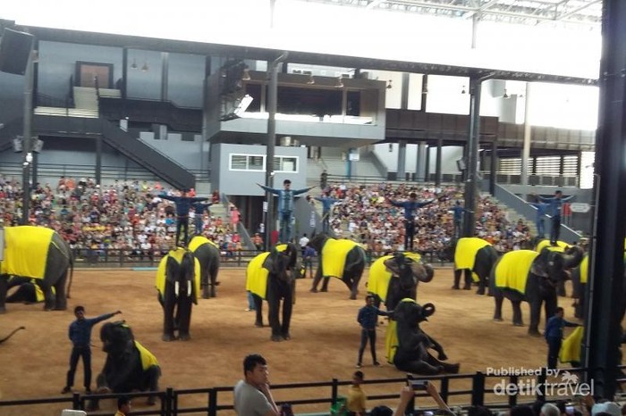 Jakarta - Ada lagi pertunjukan lain di Thailand yang amat seru. Masih di Nong Nooch Village, komplek wisata lestari tak jauh dari Pattaya, terdapat pertunjukan gajah paling memukau.Namanya Pattaya Elephant Show. Di pertujukan ini, kita bakal dibuat kagum oleh polah gajah-gajah terlatih dalam memperagakan atraksi yang lazimnya dilakukan oleh manusia. Apa saja itu?"Sekarang kita ke tempat pertunjukan gajah. Ayo cepat," seru Oom Pacha, salah satu guide di Thailand.Oom Pacha sudah hafal betul seluk beluk tempat itu. Ia menyelinap di antara pengunjung yang beradu kecepatan siapa yang lebih dahulu datang ke arena.Karena terlambat barang sedetik pun, tidak akan mendapatkan tempat duduk. Tempat ini rupanya selalu sesak oleh wisatawan yang penasaran ingin melihat gajah-gajah dalam melakukan atraksi. Suasana dalam arena akan mengingatkan Anda pada sebuah film zaman Romawi saat sekelompok orang hendak menonton sebuah pertandingan adu kekuatan. Itulah suasana di Nong Nooch Pattaya Elephant Theater.Suara sorak sorai dalam beragam bahasa, memenuhi setiap sudut arena yang mulai penuh oleh turis dari beragam negara. Inilah salah satu pertunjukan gajah paling memukau. Ibarat di sebuah stadion, posisi tempat duduk spesial ada tribun utama yang biasa di tempati petinggi negara. Atraksi demi atraski yang dilakukan oleh gajah-gajah itu akan bisa disaksikan dengan leluasa.Riuh penonton kembali membahana diikuti belasan ekor gajah yang keluar dari sebuah ruangan, dari yang paling kecil hingga gajah besar lengkap pawang di atasnya. Irama musik khas Thailand yang menggelegar seantero arena menambah seru suasana.Dengan cekatan, gajah-gajah itu pun mulai melakukan atraksi demi atraksi. Sebelumnya, mereka akan menyapa dengan mengelilingi arena seraya mengibas-ngibas belalainya.Sebagaimana instruksi yang diberikan, gajah-gajah itu mulai unjuk kebolehan mereka. Pertama-pertama, mereka memperagakan sebuah tari mengikuti irama musik yang ada. Beberapa dari gajah-gajah itu ada pula yang berjoget layaknya penyanyi dangdut di Indonesia. Suara tawa pun pecah seketika.Atraksi pembuka itu diikuti atraksi lain yang tak kalah memukau, mulai dari melukis dengan belalai, mengangkat beberapa orang penonton dengan belalai, meniru eksekutor sepakbola saat melakukan tendangan penalti, bermain basket, duduk pada sebuah kursi, bermain holahop. Adapula atraksi paling memacu adrenalin, yakni berjalan di antara para penonton yang terbaring rapi di arena atraksi. Menarik sekali bukan?Sebelum pertunjukan usai, gajah-gajah itu kembali menyapa. Sebelum meninggalkan arena, para penonton pun diberi kesempatan untuk berfoto bersama gajah hanya dengan membayar beberapa bath saja. Kesempatan langka itu amat sayang untuk dilewatkan.Tertarik? Singgahlah ke Nong Nooch Village apabila sedang berada di Thailand.