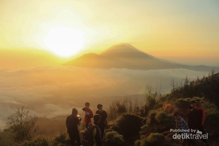 Jakarta - Bukan di pinggir pantai, tempat terbaik melihat matahari terbit di Bali adalah di Gunung Batur. Lihatlah, Sang Surya muncul dari balik awan. Indahnya!Perlu kalian tahu, Gunung Batur ini merupakan sebuah kawasan wisata yang berada di Geopark pertama di Indonesia. Dan untuk melakukan trekking menuju puncak batur kita wajib menggunakan guide dan peraturan ini tertulis secara nyata di depan tempat aku duduk. Dan bisa dibayangkan jika aku seorang diri menyewa seorang guide, bisa dipastikan pengeluaran akan semakin membengkak apalagi jika menjadi gembel ulung seperti aku ini. Bisa dikatakan kemanan pun pergi harus bisa mengeluarkan biaya sesedikit mungkin.Aku memutar otak mencari cara bagaimana agar pagi ini aku bisa lolos dari gerbang masuk di Pura Jati Luhur ini, dan aku duduk di kegelapan adalah caraku untuk tak terlihat dari sekumpulan guide yang menunggu para tamu yang berkeinginan untuk trekking ke Gunung Batur.Tiba tiba ada seorang lelaki muda duduk tepat disebelahku dan menyalakan rokok yang dibawanya. Iseng pun aku coba memulai obrolan dengannya, "Sedang menunggu tamu kah mas?, Mau ngantar ke atas juga," tanyaku pada seorang lelaki muda yang aku yakin pasti seorang guide dari penduduk sekitar."Enggak mas, saya sedang malas tapi biasanya memang sering mengantar tamu," sahut sang lelaki muda ini. "Masnya dari mana? Mau naik gunung batur juga?,"."Iya mas, saya masih menunggu teman.. tadi katanya mau ketemuan di sini, tapi ini saya tunggu kok enggak datang datang", timpalku sedikit berbohong jika saat itu aku sedang sendiri saja.Dan seiring kemudian obrolan kami pun semakin berlanjut. Mulai dari pertanyaanku bagaimana jalur menuju keatas hingga suka duka dia menjadi guide gunung batur ini, hingga aku berkata seperti ini "Mas jika aku berjalan sendiri dan mengikuti para bule itu dari belakang apakah bisa ya?".Sang guide muda ini pun berkata "Silakan saja mas, ikuti mereka diam diam dari belakang atau berbaur saja langsung", pasti tidak ada yang mengetahui dan melarang.Seakan mendapat lampu hijau dari salah satu guide baik hati ini, semangat pun langsung berkobar. Demi mengejar matahari terbit aku pun segera berpamitan kepada guide muda yang belum sempat aku tanya namanya ini.Mengikuti sekumpulan bule dengan para guide di depannya ini aku pun membuntuti mereka. Di dalam kegelapan ini aku mencoba menyalakan senter dan berjalan seirama dengan langkah cepat mereka. Jalan masih terasa datar yang berada di tengah perkebunan. Ayunan langkah para bule ini memang terkesan panjang dan cepat, dan aku semakin kewalahan mengikuti langkah langkah mereka. Hingga akhirnya aku terhenti di sebuah tanah lapang di tengah bebatuan vulkanis, gerombolan bule yang aku ikuti tadi pun meninggalkanku seorang diri. Nafas tersengal sengal, degup jantung pun terasa berpacu lebih cepat dari biasanya. Aku coba menenangkan ritme nafas terlebih dahulu sebelum melanjutkan perjalanan. Dari tempatku berhenti ini jalur nampak jelas, apalagi dengan kerlipan senter para bule yang berjalan di kejauhan membuat navigasi perjalanan semakin mudah.Sekitar 45 menit berjalan aku bertemu dengan plang bertulisakan POS 1, dan disebelahnya terdapat arah panah yang menunjukkan jalur menuju puncak Gunung Batur. Aku mencoba menerawang kontur jalur yang ada di depan, kilatan lampu senter pun membiaskan bayangan jalur miring yang harus aku lalui sebentar lagi.Jalur berkerikil bercampur pasir dengan kemiringan sekitar 45 derajat adalah gambaran kecil jalur yang harus dilalui. Dengan berjalan perlahan dan mengatur ritme nafas aku coba untuk melangkahkan kaki kembali. Bayangan bayangan hitam pun mulai nampak seiring dengan aku tiba di puncak pertama Gunung Batur. Bayangan bayangan hitam ini sebenarnya sebuah kerucut besar badan sang gunung bernama Gunung Abang berpadu dengan dataran kaldera Kintamani yang mengitari kawasan geopark pertama di Indonesia ini. Dan sedikit memicingkan mata aku pun dapat melihat puncak dari Gunung Agung yang berada tepat di belakang Gunung Abang.Dari sini panorama keindahan khas Gunung Batur bisa kita nikmati. Melongok ke depan kita akan disuguhi keindahan danau vulkanik Batur yang dikelilingi kaldera Kintamani. Tepat di kaldera ini pun terdapat Gunung Abang yang sedikit menutupi kemegahan Gunung Agung di belakangnya. Dan di belakang tempat aku berdiri ini terdapat sebuah kawah vulkanis dari Gunung Batur sendiri. Dinding dinding kawah batur ini menyiratkan sebuah letusan dahsyat pada masa lampau dan sampai sekarang pun kawah ini masih aktif. Sehingga kawasan di sekitar Gunung Batur ditetapkan sebagai kawasan rawan bencana. Dan karena semua keindahan dan keunikan yang dimiliki kawasan batur pada tahun 2012 UNESCO akhirnya menetapkan kawasan kaldera batur ini menjadi taman bumi atau Geopark pertama di Indonesia. Penjelasan lainnya tentang Geopark ini adalah sebuah kawasan atau situs warisan geologi (geological heritages) yang mempunyai nilai ekologi dan warisan budaya (cultural heritages) dan berfungsi sebagai daerah konservasi, edukasi dan sustainable development. Dan perasaanku saat berada di Geopark pertama Indonesia ini adalah rasa bangga, karena Indonesia mempunyai Geopark dengan keberagaman seperti di Batur ini, dan yang semakin bangga adalah ratusan wisatawan luar negeri yang berbondong bondong datang ke Batur untuk menikmati salah satu sudut keindahan surga Indonesia.Dan tak terasa akhirnya aku pun mengelilingi kaldera kawah Gunung Batur. Dan di setiap sisi yang aku lewati memberikan sebuah perspektif lebih jauh tentang keindahan yang ada di dalam kawasan geopark Batur. Karena di setiap sisi perjalanan di atas gunung ini memberikan sudut pandang 360 derajat dan kita bisa menikmati semuanya tanpa halangan sedikit pun.Dan selama hampir 2 jam berkeliling kaldera Gunung Batur ini aku pun kembali ke puncak pertama. Karena matahari yang semakin terik dan panas maka aku akhirnya harus segera kembali ke bawah, namun sebelum berjalan kembali aku menengok ke belakang melihat kemegahan Gunung Batur.Dalam hati yang p