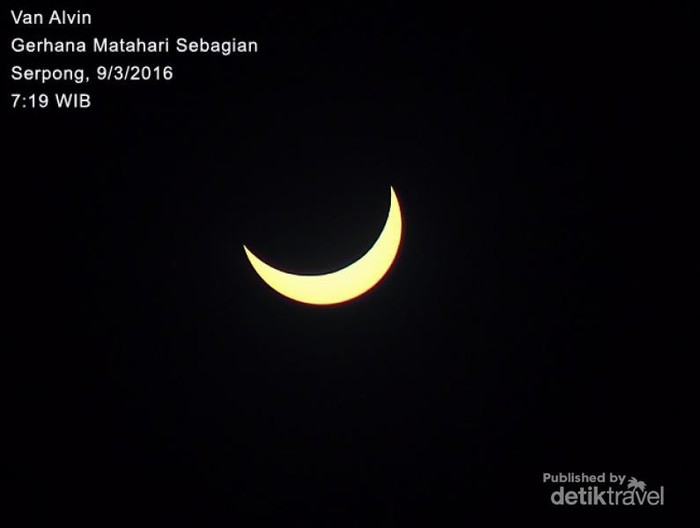 Jakarta - Momen Gerhana Matahari Total jadi buruan banyak wisatawan. Namun sayang, tidak sedikit yang gagal mengabadikannya karena kesalahan teknik atau terkendala alat.Fenomena gerhana matahari yang terjadi di Indonesia pada hari Rabu (9/3/2016) benar-benar menyedot perhatian warga lokal dan turis mancanegara. Mereka berbondong-bondong menuju ke lokasi yang menjadi titik pengamatan proses terjadinya gerhana matahari yang fenomenal tersebut.Ada yang hanya sekadar menyaksikan, namun tidak sedikit pula yang ingin mengabadikan momen langka itu dengan kamera atau gadget yang dibawa. Tapi tidak semua yang ingin memotret kejadian itu berhasil lho. Banyak yang kecewa karena foto gerhana matahari hasil jepretannya tidak sesuai harapan karena persiapan dan perlengkapan yang kurang memadai.Seperti beberapa orang yang saya jumpai ketika sedang memotret gerhana matahari sebagian (GMS) di kawasan Serpong, Tangerang Selatan. Seorang bapak yang ingin mengabadikan momen itu dengan kamera ponselnya harus kecewa dengan hasil jepretannya.Fitur kamera ponsel yang serba auto dan lensa yang tidak memiliki fungsi tele, membuat foto yang dihasilkan hanya berupa foto pemandangan siluet objek yang ada di sekitarnya saja. Meski matahari sudah tertutup bayangan bulan, namun yang terlihat di ponsel tetaplah matahari yang terang benderang dan berukuran sangat kecil.Lain lagi pengalaman Theo dan Kris. Dua warga Pamulang ini membekali diri dengan peralatan kamera DSLR dan lensa tele yang cukup canggih saat pemotretan. Namun hal tersebut tidak menjadi jaminan.Mereka juga gagal mengabadikan proses terjadinya gerhana lantaran tidak membekali peralatan canggihnya dengan filter Neutral Density (ND) yang mumpuni untuk mengurangi intensitas cahaya matahari yang sangat tinggi."Gak dapat mas. Begini semua hasilnya," kata Kris, sambil menunjukkan hasil jepretanya.Kasihan melihat usaha yang sudah dilakukan, saya pun meminjamkan potongan film rontgen yang saya manfaatkan sebagai filter ND. Kebetulan saya membawa lebih, jadi bisa berbagi kepada mereka.Sebuah pesan singkat dari seorang teman yang juga anggota komunitas d'Traveler masuk ke ponsel saya sesaat setelah saya memposting foto hasil jepretan gerhana ke grup tersebut."Mas, ambil foto gerhananya pakai settingan mode apa di kameranya?" begitu tanya teman tersebut.Sayangnya karena asyik motret, pesan tersebut baru saya baca ketika saya selesai memotret gerhana. Walhasil, teman saya juga gagal mengabadikan proses terjadinya gerhana dengan kameranya karena tidak tahu tips yang tepat untuk memotret peristiwa itu.Itulah pengalaman dari beberapa orang yang gagal mengabadikan kejadian langka gerhana matahari dengan gadgetnya. Apakah Anda juga termasuk di antaranya? Jika iya, semoga Anda bisa mempersiapkan peralatan dengan lebih baik lagi jika punya kesempatan lainnya untuk mengabadikan gerhana matahari di Indonesia.