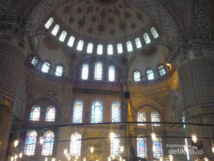 Jakarta - Traveler yang datang Turki akan dihadapkan dengan banyak bangunan masjid yang rupawan. Belum lengkap berkunjung ke Turki bila tidak datang ke Blue Mosque, masjid bewarna biru yang menawan di Istanbul.Bangunan ini memang tepat disebut sebagai Blue Mosque. Hal ini karena kubah masjid yang dibangun oleh Sultan Ahmed pada tahun 1609 untuk menandingi Hagia Sofia ini berwarna biru.Pelataran masjid dengan koridor yang langit-langitnya dihiasi kaligrafi dan corak-corak khas Turki membuat saya kagum. Di tengah pelataran masjid terdapat tempat wudu khas masjid di Turki, yaitu bangunan kecil segi lima yang ditopang beberapa tiang, dengan atap menyerupai kubah, dan keran air di sekelilingnya.Bagian depan masjid digunakan bagi para pria melaksanakan salat. Sedangkan untuk wanita disediakan tempat khusus di bagian belakang yang lebih tertutup.Para turis yang ingin menikmati indahnya Blue Mosque hanya dapat berkeliling di bagian belakang tempat salat para pria, yang dibatasi oleh pagar pendek. Untuk masuk ke dalam masjid dengan 6 menara ini, semua turis harus berpakaian sopan. Sehingga disediakan kerudung untuk turis wanita.Yang menakjubkan dari interior Blue Mosque adalah kaligrafi, corak bunga-bunga, tanaman dan mozaik pada dinding dan langit-langitnya dengan perpaduan warna biru, ungu, coklat dan salem yang sangat artistik. Di beberapa bagian dinding masjid juga terdapat kaligrafi yang diukir sangat indah.Di tengah masjid tergantung lampu-lampu yang digantung pendek. Khas dari masjid-masjid di Turki ini, kubahnya tidak hanya satu. Di sekeliling tiap kubah, terdapat jendela-jendela, sehingga matahari bisa masuk ke dalam masjid. Tidak salah memang kalau orang menyebut tempat ini sebagai salah satu masjid tercantik di dunia.