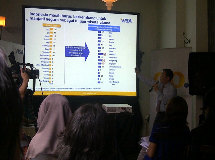 Jakarta - Tengah tahun ini, Visa mengadakan survei tentang minat wisatawan mengunjungi Indonesia. Ternyata ada 3 alasan lho mengapa wisatawan datang ke Indonesia, yaitu untuk melakukan aktivitas outdoor, mencicipi kuliner Indonesia, dan berolahraga air. Survei yang dilakukan Visa tengah tahun ini adalah yang keenam dan pertama kali diadakan secara global. Survei ini melibatkan 11.620 responden, 23 negara dari 3 benua, yang merupakan nasabah Visa."Berbeda dengan survei sebelumnya, survei tahun ini dilakukan secara global, tidak hanya mencakup wilayah asia pasifik, tetapi juga luar Asia Pasifik," kata Presiden Direktur PT Visa Worldwide, Ellyana Fuad, pada jumpa pers di Restoran Seribu Rasa, Jl H Agus Salim 128, Menteng, Rabu (28/12/2011).Dari survei, ternyata ada 3 alasan mengapa wisatawan datang berkunjung ke Indonesia. Alasan pertama adalah karena Indonesia memiliki tempat asyik untuk melakukan aktivitas outdoor, seperti golf.Wisatawan mancanegara yang kebanyakan berasal dari Singapura dan Malaysia ini, lebih memilih bermain golf di Indonesia ketimbang negaranya sendiri. Ini karena fasilitas yang memadai, ditambah pemandang indah yang bisa dilihat dari sekitar lapangan golf. "Tak tanggung-tanggung, hampir setiap minggu mereka datang untuk bermain golf di Indonesia," ujar Elly.Daya tarik lain yang mengundang wisatawan datang ke Indonesia adalah untuk berwisata kuliner. Indonesia yang memiliki banyak provinsi tentu kaya dengan makanan khas di setiap daerahnya. Ini mengundang para wisatawan untuk datang mencicipi aneka makanan lezat dari Indonesia. "Salah satu contoh yang menjadi daya tarik wisatawan adalah jamu tradisional. Jamu memiliki rasa yang khas dan sangat menarik wisatawan," ungkap Elly.Nah, olahraga air ternyata di posisi ketiga alasan wisatawan mengunjungi Indonesia. Kini, olahraga air memang tengah marak di Indonesia, banyak wisatawan baik lokal maupun mancaranegara yang datang untuk menikmati keindahan alam sambil berolahraga air. Salah satu olahraga air yang paling banyak diminati adalah surfing di Kepulauan Mentawai, Sumatera Barat."Mentawai adalah second best surfing place in the world setelah hawai, tak heran bila wisatawan berbondong-bondong datang ke sana," kata Elly.Selain Mentawai, kawasan yang ramai dikunjungi adalah Raja Ampat, Papua. Banyak wisatawan yang diving dan snorkeling menikmati alam bawah lautnya.Ayo! Kita tingkatkan pelayanan pariwisata Indonesia, supaya semakin banyak wisatawan yang datang.