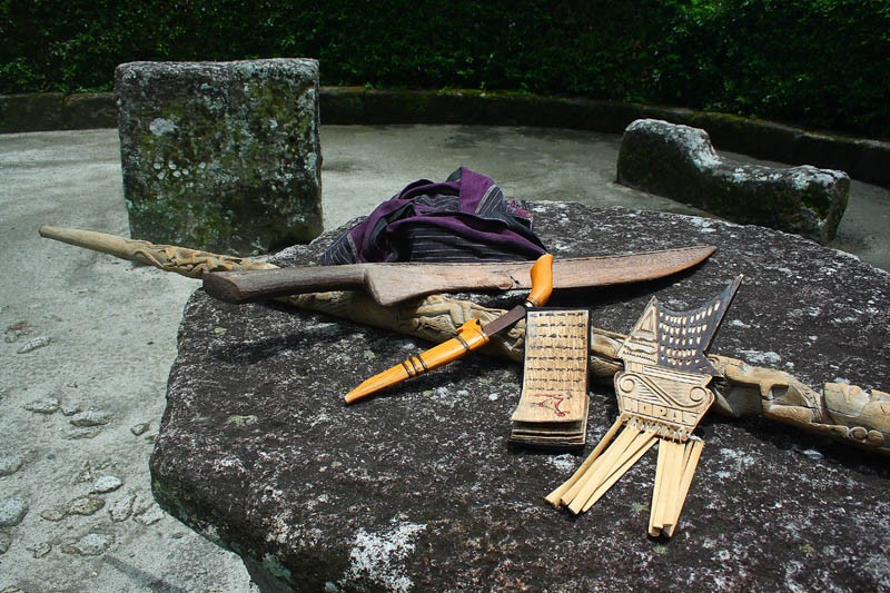 Alat yang digunakan untuk eksekusi (ki-ka) ulos untuk menutup mata tawanan, kapak untuk memenggal kepala, pisau kecil untuk menyayat, buku mantra, dan kalender Amabarita, serta tongkat.