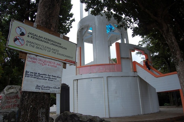 Di seberang jalan tugu tersebut, terdapat sebuah batu penanda jarak berwarna kuning seperti yang biasa terlihat di pinggir jalan. Bedanya di batu tersebut tertulis angka nol. Sebuah angka yang tak akan Anda temukan di batu penanda jarak lainnya di manapun di Indonesia. Di tempat ini pula, Anda dapat memandang lepas ke arah Samudra Hindia. Pemandangan dari atas bukit ini indah sekali dengan latar laut membiru dan tiupan angin kencang menderu.