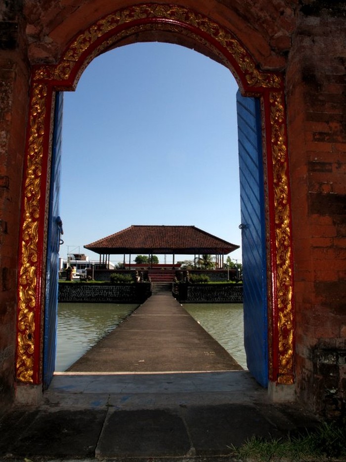 Β Namun yang menarik adalah bangunan Bale Kambang yang berada di tengah-tengah kolam air. Di sekitar Bale Kambang ini dihiasi oleh patung-patung bercirikan orang muslim, yaitu Arab, Muslim Cina, dan Jawa. patung orang muslim tersebut berdiri di bagian Barat, Timur dan Utara dari Bale Kambang berdampingan dengan bangunan linggih yang sangat kental nuansa Hindu Bali-nya.