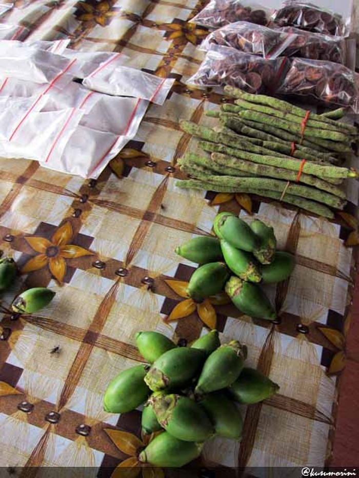 Duduk menunggu hujan reda kami disambangi Pak Alfaris. Kami pernah bertemu dengan Pak Alfaris sebelumnya di atas ferry dari Sorong ke Waisai. Setelah sedikit mengobrol, Pak Alfaris berujar "Harus coba pinang sirih!". Dan benar saja. Pak Alfaris mencomot beberapa pinang, sirih, dan kapur dari salah satu penjual lalu meletakkannya di meja depan kami.