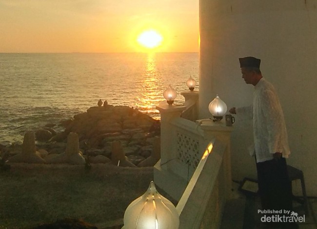 Dari pelataran masjid yang luas dan lapang, puluhan pengunjung berbaur dengan jamaah yang sama menantikan masuknya waktu Magrib. Mesjid indah yang dibalut oleh dominasi warna putih, dengan empat tiang menara yang menjulang tinggi tampak begitu sakral dan magis, menghadap ke lautan luas di depan yang ombaknya berlarian kejar mengejar seiring dengan tiupan angin ke daratan.