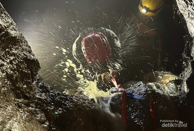 Tidak lama berjalan, kami mendapatkan tantangan yang cukup menyulitkan. Kita harus melewati lorong yang terisi air atau biasa disebut sump. Saat sump kita harus sangat berhati-hati. Kami pun harus antri bergantian untuk nge-sump. Sump ini sebagai salah satu tantangan yang ada di Gua Cikenceng. Setelah kita melewati sump, perjalanan kita tidak jauh lagi untuk sampai ke pintu keluar gua. Sebelum sampai ke finish kita akan ornamen gua yang merupakan ikon dari gua ini.