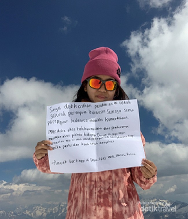 Mahasiswi Jurusan Biologi ini, mempunyai suatu misi saya untuk mendaki ke Gunung Elbrus, namun tak hanya mendaki saja, tetapi juga untuk merayakan kemerdekaan Indonesia serta menyuarakan hak-hak wanita, dan mempromosikan Indonesia ke kalangan alpinis atau pendaki gunung internasional.