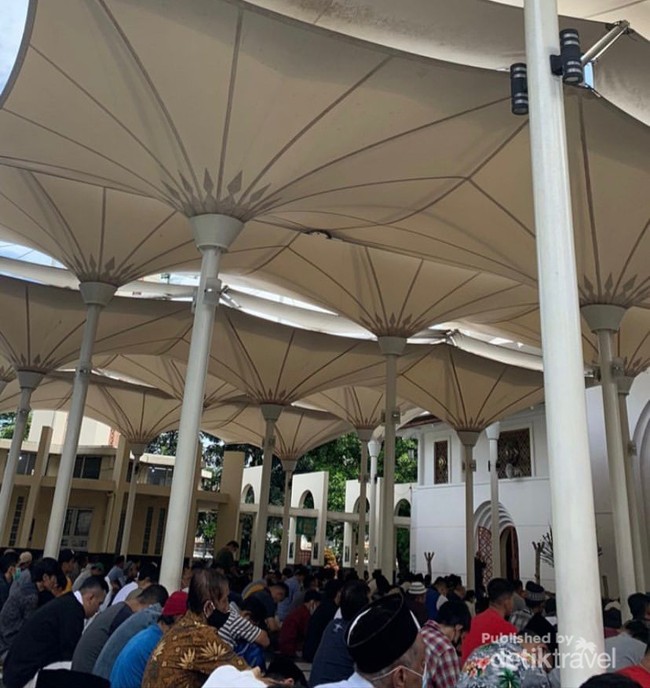 Bangunan masjid yang menjulang tinggi dan menyerupai kubah Masjidil Haram memberikan nuansa khusyuk sekaligus memancarkan keindahan seni arsitektur Islam. Detail-detail indah seperti kaligrafi dan ornamen khas Makkah memberikan pengalaman visual yang mendalam bagi para pengunjung, seolah membawa mereka merasakan keanggunan masjid suci di tanah suci.
