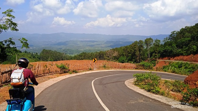Di sepanjang jalan banyak pohon pinus, sawah dan tanaman palawija juga lainnya. Ada satu spot di mana kita bisa melihat daratan di bagian bawah.