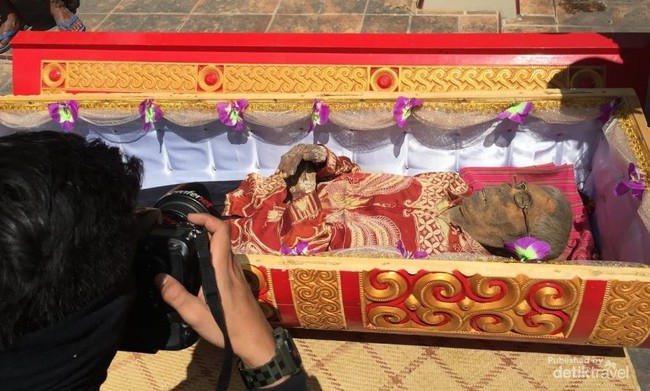 Menggunakan baju baru lengkap dengan aksesoris seperti kacamata dan topi. Oh iya, sebenarnya bukan tanpa alasan mengapa upacara adat ini disebut upacara adat mayat berjalan. Karena setelah jenazah dikeluarkan dari peti, jenazah akan dibawa berkeliling area pemakaman. Ya, seperti berjalan dengan cara dituntun.