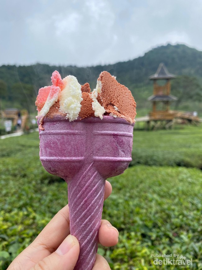Favorit anak-anak saya adalah penjual es krim yang membuka lapaknya di depan kebun teh. Es krim yang dijual adalah es krim biasa yang diberi wadah double cone.