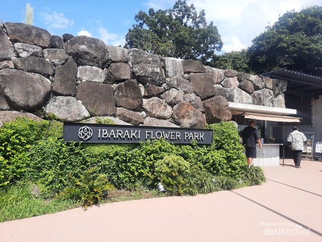 Di samping salah satu undakan tersebut terdapat plang "Ibaraki Flower Park", yang simetris dengan bangku kayu putih di depannya. Tentu saja, kami tidak melewatkan foto-foto di sana. Untuk masuk ke taman ini kami diharuskan membeli tiket.