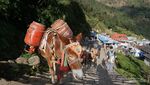Jalur masih berupa tangga-tangga batu, sesekali kami berpapasan dengan rombongan kuda, keledai milik warga yg melintas di jalur, kami harus minggir mengalah, memberi jalan mereka agar tidak diseruduk.