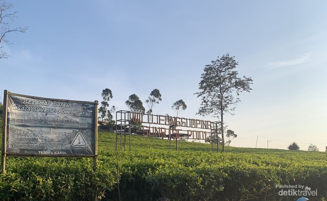 Segera setelah Anda tiba di Sunrise Point Cukul, Anda akan disambut dengan hamparan perkebunan teh yang hijau dan sejuk, ciri khas Pangalengan.