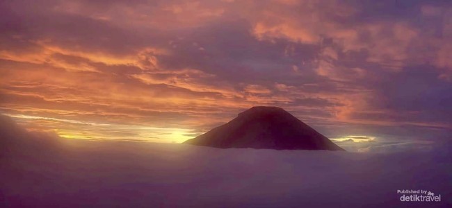 Indah sekali. Gunung Sindoro terlihat seperti segitiga biru yang melayang di antara lautan awan. Beberapa kali semburat jingga yang dinanti-nanti juga turut memanjakan mata.