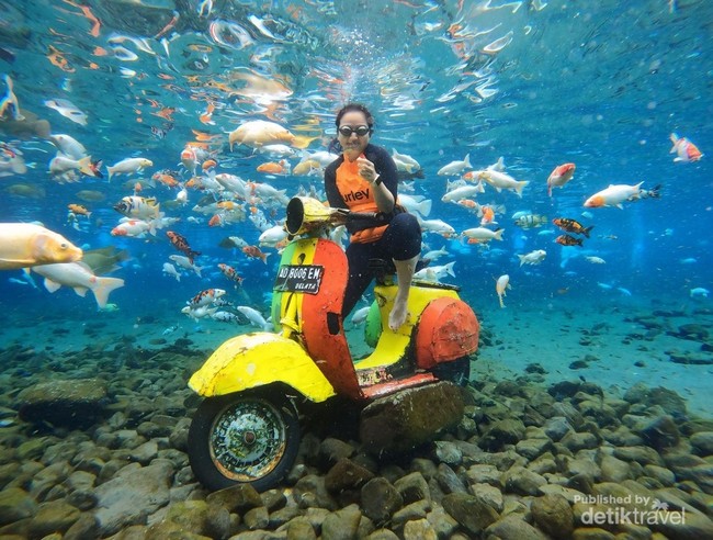Ragam pilihan latar foto di sini, mulai vespa, papan kayu, jembatan,laptop dan kursi, sepeda ontel, motor jenis lainnya dan masih banyak lagi atau area yang didekorasi cantik. Footo semakin keren dengan banyaknya ikan yang berenang di sekitar kita.