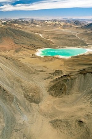 Warna hijau kebiruan yang cerah itu berasal dari mineral dan tembaga. Laguna Verde memang terletak persis di kaki gunung berapi Licancabur. Kalau beruntung, traveler bisa melihat kumpulan burung pink Flamingo sdang bermain di permukaan danau.