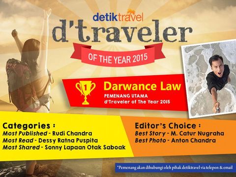 Darwance Law dinilai tim juri berhak atas gelar sebagai d'Traveler of The Year bukan hanya karena rajin menulis, foto dan aktivitas di social media saja. Kegigihan dan konsistensinya mengangkat destinasi di Bangka Belitung, serta angle-angle yang menarik dari tiap artikelnya, memberikan nilai lebih di atas rata-rata.