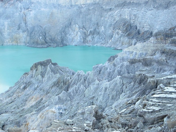 Layangkan pandangan Anda ke segala penjuru saat menuju dasar Kawah Ijen. Lihatlah, formasi bebatuan di sana benar-benar menarik untuk diabadikan dalam kamera. Batu-batunya kebanyakan berwarna abu-abu dan terlihat terkikis. Anda pun harus melewati bebatuan tersebut untuk mencapai dasar Kawah Ijen.