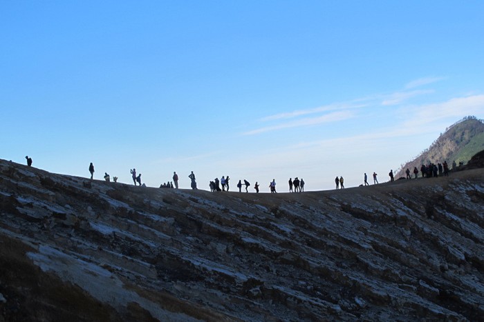 Pagi hari di Kawah Ijen terasa begitu magis. Cahaya matahari membuat panorama di sana mampu membuat siapa saja takjub. Tengoklah ke bagian atas kawah, jika Anda sedang di dasar kawahnya. Deretan wisatawan yang berdiri di sana terlihat bagaikan pohon-pohon saja.