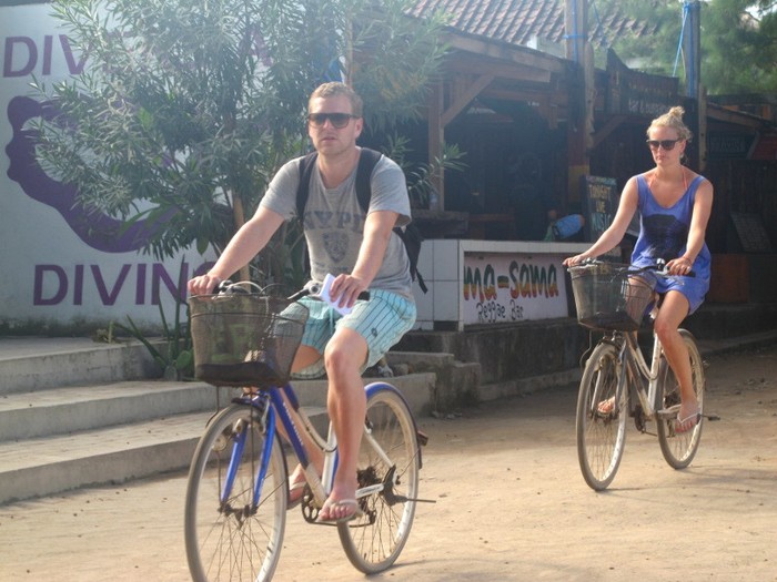 Jangan heran, ketika melihat bule lalu lalang di Gili Trawangan naik sepeda. Hal yang lucu, adalah ketika mereka menggunakan mulut sebagai klakson. Mereka bakal berucap, "Tin..tin..tin..tin!".