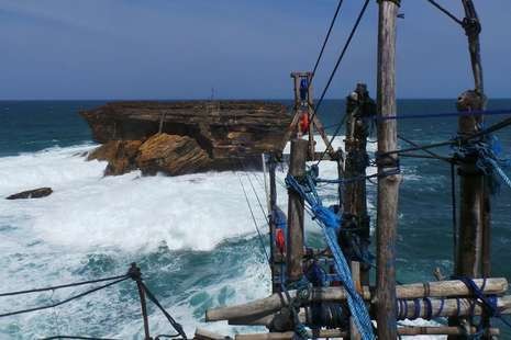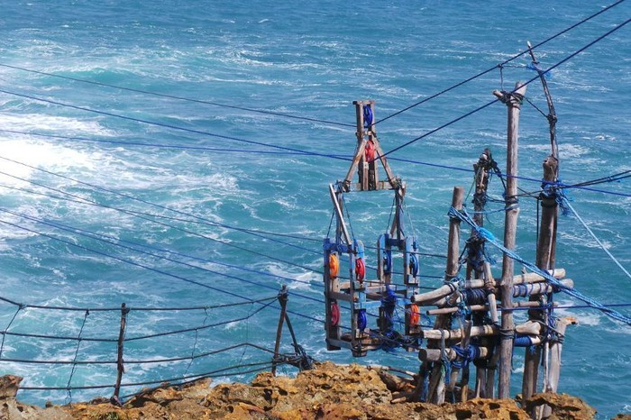 Gondola itu terletak di atas tebing, dengan ketinggian sekitar 50-60 meter. Ini merupakan 'alat transportasi' para nelayan menuju pulau karang di tengah laut tersebut. Mereka tak lagi harus berenang di perairan ganas.