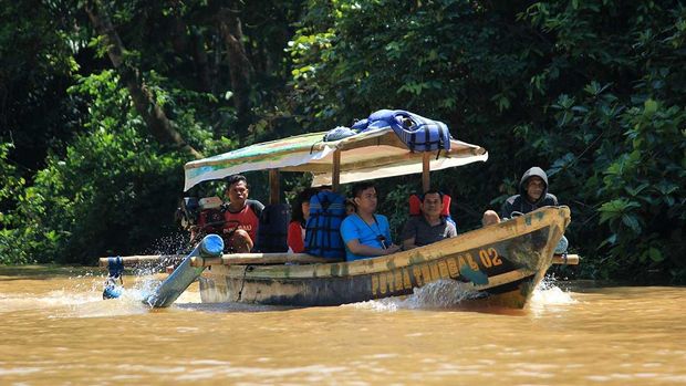 Menaiki perahu ketinting untuk menuju mulut gua (Randy/detikTravel) |