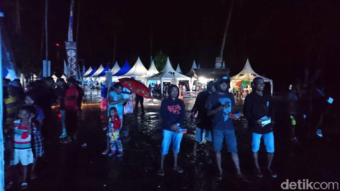 Hujan rintik-rintik sedari sore tak menyurutkan niat warga datang ke malam puncak HUT Raja Ampat XIV di Pantai WTC, Kota Waisai. Walau mempunyai destinasi alam amat memukau, warga yang datang tetap membutuhkan hiburan lainnya.