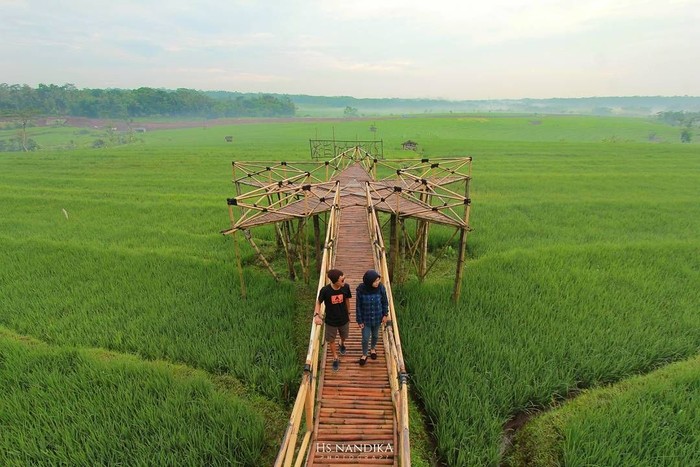 Ketiga, sawah zaman now ini ada di Yogyakarta. Inilah jembatan bambu di Persawahan Sukorame, Desa Dlingo, Kabupaten Bantul, Yogyakarta. Meski hanya jembatan di atas persawahan namun banyak dikunjungi wisatawan. (msl/aff)