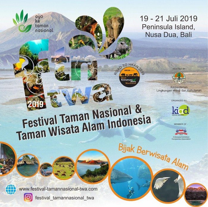 Informasi yang dihimpun detikcom, Rabu (19/6/2019) Festival Taman Nasional dan Taman Wisata Alam 2019 akan digelar pada 19-21 Juli 2019 mendatang di Peninsula Island, Nusa Dua Bali. Ini adalah pagelaran ketiga kalinya setelah sukses dengan dua pagelaran sebelumnya di Banyuwangi dan Prambanan, Yogyakarta.