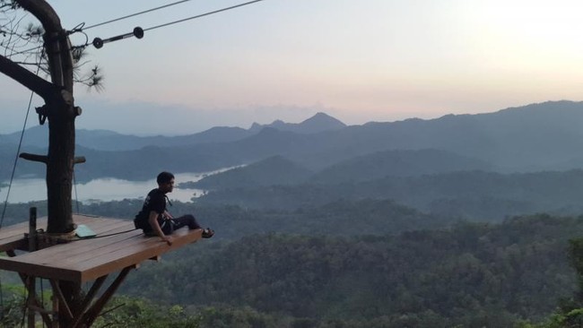 Wisata kekinian ini bernama Wisata Alam Kalibiru, wisata alamnya menyuguhkan pemandangan berupa Waduk Sermo dan hamparan hutan yang luas.