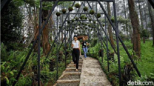 Instalasi seni di tengah area hutan menjadi incaran banyak pengunjung. Pun berbagai spot foto dibuat seakan tersembunyi agar wisatawan bisa berolahraga untuk mencapainya.