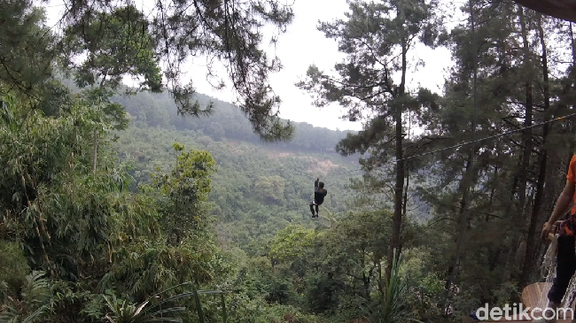 Travelers nanti akan dijamu dengan menggunakan zipline bergelantungan dari satu pohon pinus ke pohon pinus lainnya dari satu bukit ke bukit lainnya menyeberangi Curug Nangka dan Curug Daun.