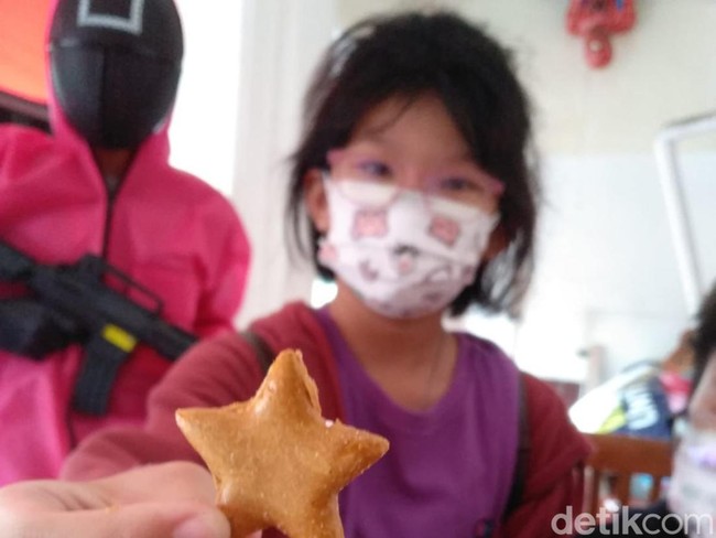 "Jadi setelah mereka selesai (keliling instalasi), mereka menyerahkan voucher ini untuk ditukarkan dengan dalgona candy. Pengunjung diberi waktu dua menit untuk main game, kalau dalam dua menit mereka bisa perfect memotong permen sesuai bentuknya, bisa langsung dapat hadiah uang Rp 50.000, tapi jika kalah langsung ditembak (tembak mainan)," terang Rere.