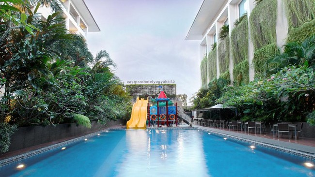 Satu lagi hotel yang cocok untuk liburan keluarga adalah Eastparc. Kolam renangnya bukan hanya berukuran besar, tapi dilengkapi dengan seluncuran dan tempat bermain anak.