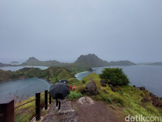Setelah hujan agak sedikit reda, detikcom pun mencoba naik ke puncak bukit pulau Padar. Dengan kondisi badan basah kuyup, kami bulatkan tekad untuk bisa sampai di ketinggian demi melihat keseluruhan pemandangan Pulau Padar. Dan tentu saja wajib mendapatkan foto biar bisa dibawa pulang.