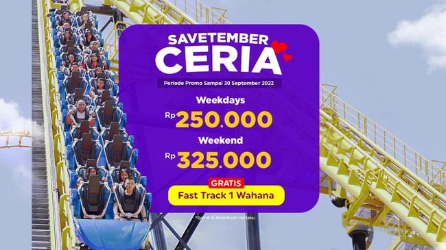 Buat kamu yang bosan antre, jangan khawatir karena kamu bisa menikmati berbagai wahana di Trans Studio Cibubur tanpa perlu antre panjang! Pasalnya, di bulan ini, Trans Studio Cibubur menghadirkan promo Savetember Ceria khusus untuk pembelian di website resmi https://www.transstudiobandung.com. Ada gratis VIP Access 1 wahana dengan harga tiket Rp 250.000 per orang untuk weekdays, dan Rp 325.000 per orang untuk weekend. Periode promo ini berlaku mulai 1-30 September 2022.