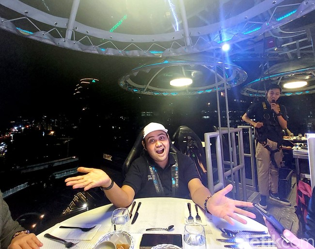 detikTravel berkesempatan merasakan sensasi makan di udara sembari menikmati city light Jakarta. Rasa deg-degan tak terelakan begitu membayangkan saat crane mengangkat meja ke udara.