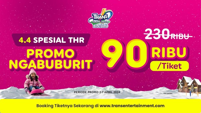 Promo ini hanya berlaku hingga 7 April 2024. Segera beli tiketmu sekarang juga melalui website resmi Trans Entertainment di https://www.transentertainment.com/ dan pastikan kamu siap untuk menghabiskan waktu yang menyenangkan di Trans Snow World Bintaro bersama orang-orang terdekatmu!