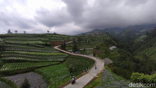 Jalannya hanya terbuat dari beton selebar sekitar tiga meter. Berkelok-kelok dan naik turun, dikelilingi oleh ladang sayuran khas dataran tinggi yang hijau dengan latar belakang panorama Gunung Merbabu. Terbayang udara sejuk dan keindahannya bukan?